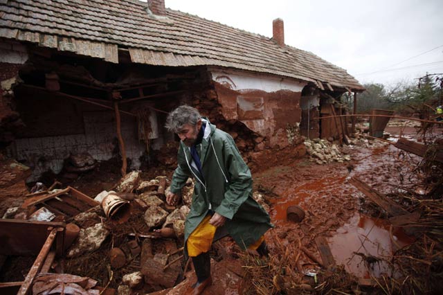 Seorang warga berjalan di depan sebuah rumah yang rusak diterjang banjir lumpur di desa Kolontar, Rabu (6/10) waktu setempat.